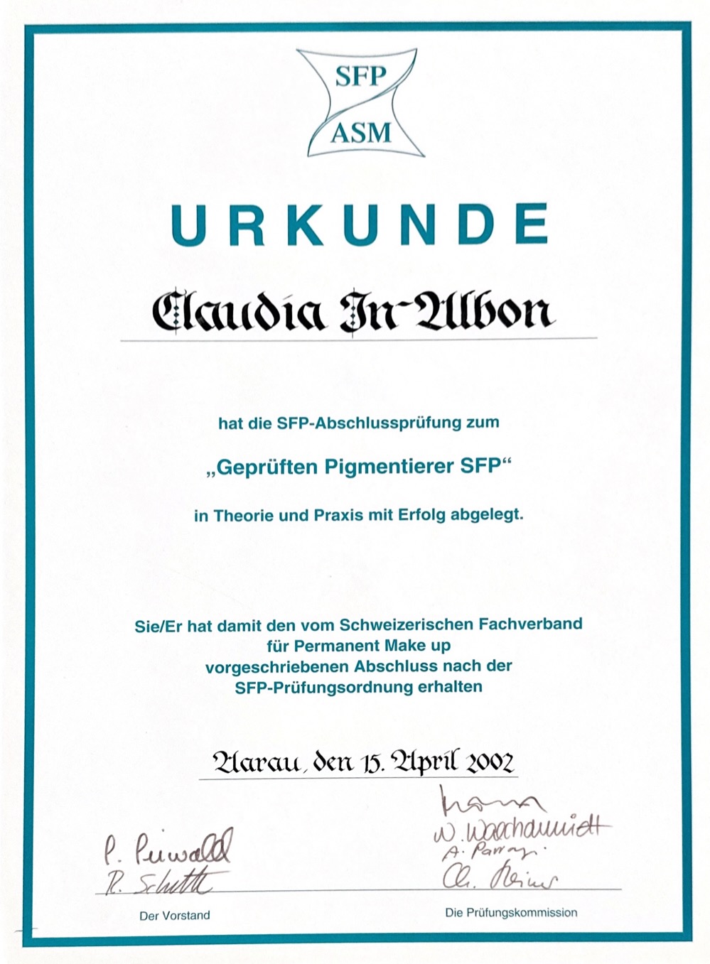 Dipl. Derma-Pigmentologin SFP seit 2002 (Urkunde)